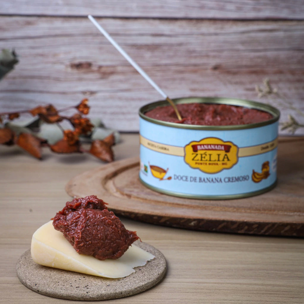 Feita devagar, no tacho de cobre e com o cuidado mineiro que respeita cada etapa, ela entrega aquele sabor profundo de banana madura que lembra doce de avó, mas com técnica de mestre.