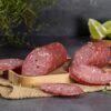 Salame de grosso calibre, utilizando paleta e pernil suíno, toucinho, condimentado com sal, pimenta e um blend de pápricas, maturado por 30 dias, o sabor marcante é a acidez da fermentação natural e levemente picante.