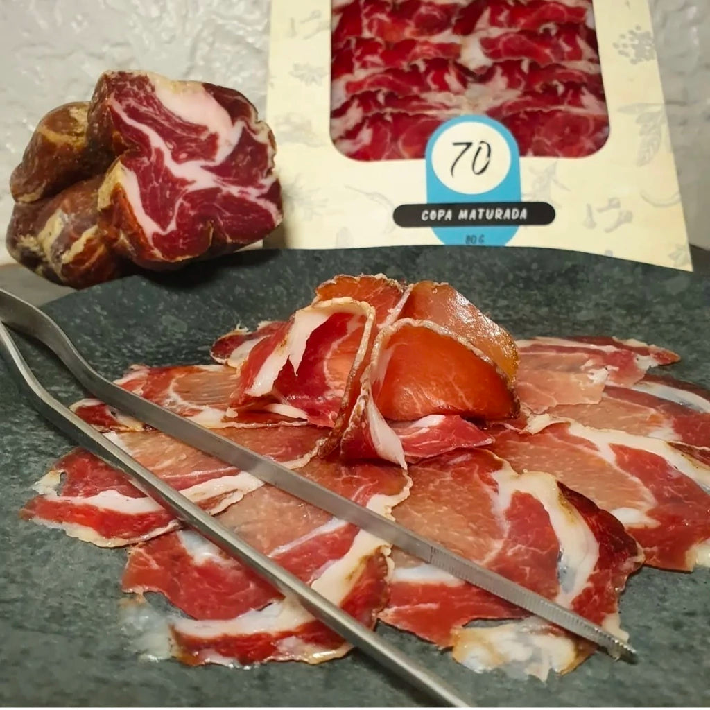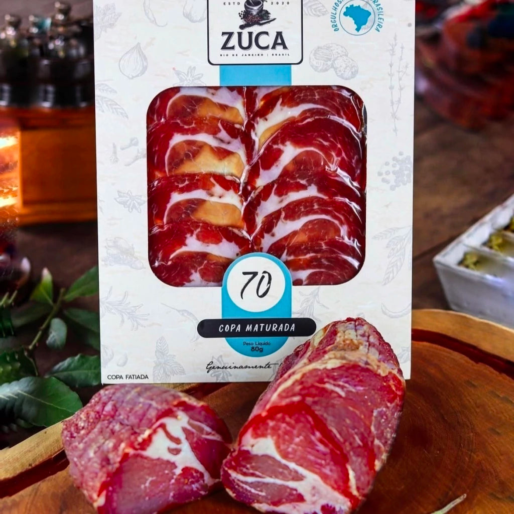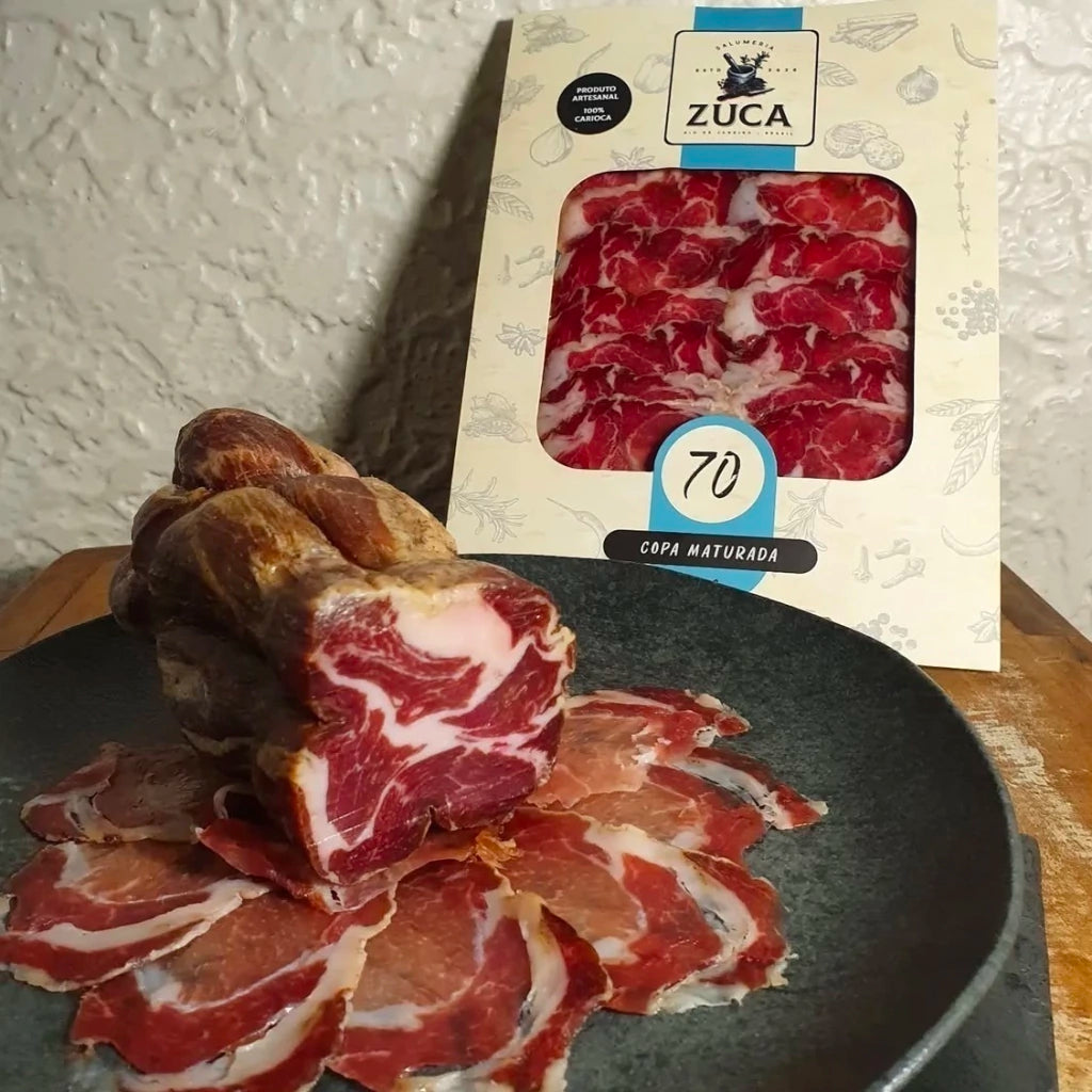 Delicie-se com a nossa Copa Maturada 1970, um corte nobre elaborado a partir da sobrepaleta suína. Cada peça é temperada com um blend especial de seis especiarias: alho, alecrim, pimenta rosa, gengibre, erva-doce e pimenta branca. Essa combinação realça o marmoreio natural da carne, trazendo aromas e sabores ricos e envolventes.